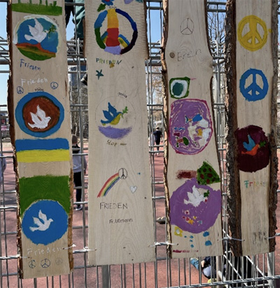 Am Montag, 28.03.2022 hat Frau Ullmann mit ihren evangelischen Religionsgruppen der Klassen 1/2ab und 4abc eine Aktion zum Thema Friedensbretter durchgeführt.